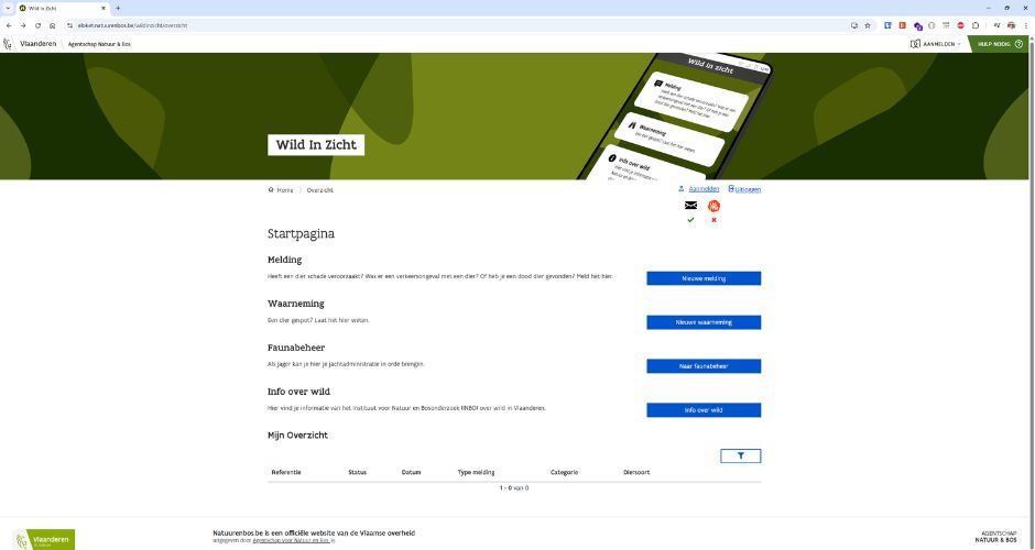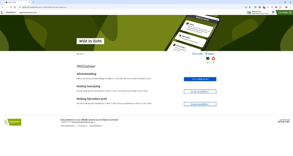 Wild in Zicht is een online platform van het Agentschap voor Natuur en Bos (ANB) waarmee snel en eenvoudig waarnemingen van wilde dieren kunnen doorgeven worden, waar valwild kan gemeld worden of waar je je afschot van grof wild kan melden.