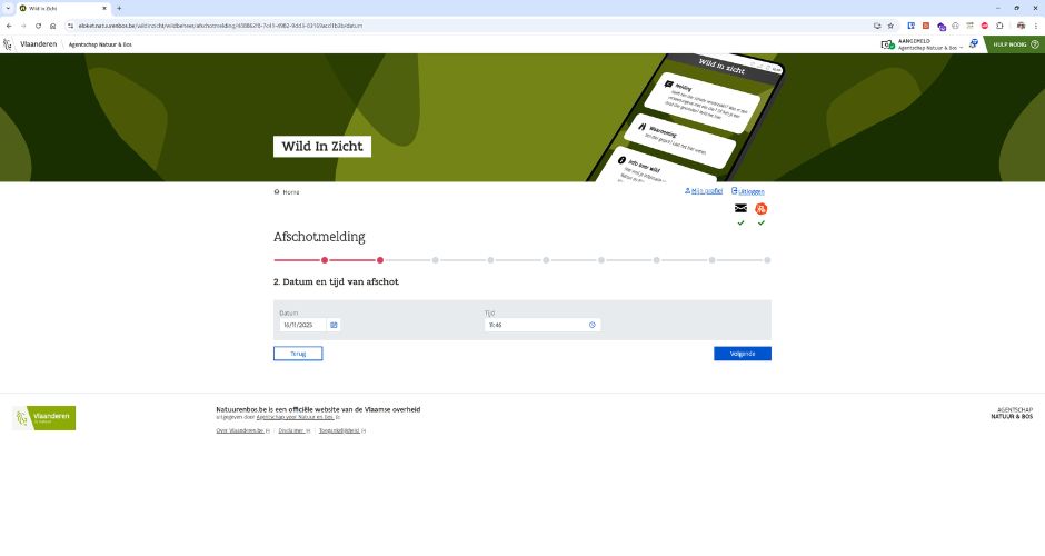Hier noteer je de dag en het uur waarop je het afschot gerealiseerd hebt, dus niet de datum van melding.
