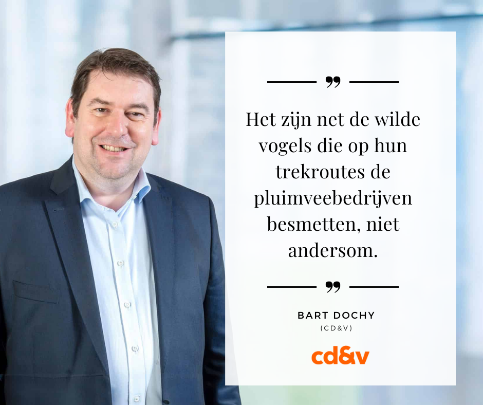 Bart Dochy (CD&V) ontkende daarnaast categoriek de stelling van Schauvliege die stelt dat de wilde dieren besmet worden vanuit de professionele pluimveehouderij. Het zijn net de wilde vogels die op hun trekroutes de pluimveebedrijven besmetten, niet andersom.