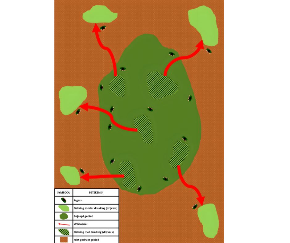 De initiële reactie: ‘We zijn daar al gaan drukken, dat is niet meer nodig.’ is een valkuil. Het gaat niet alleen om het in beweging brengen van het everzwijn. Cruciaal is dat wanneer everzwijnen zich van dekking A naar B verplaatsen, er ook in dekking B drijvers aanwezig blijven.