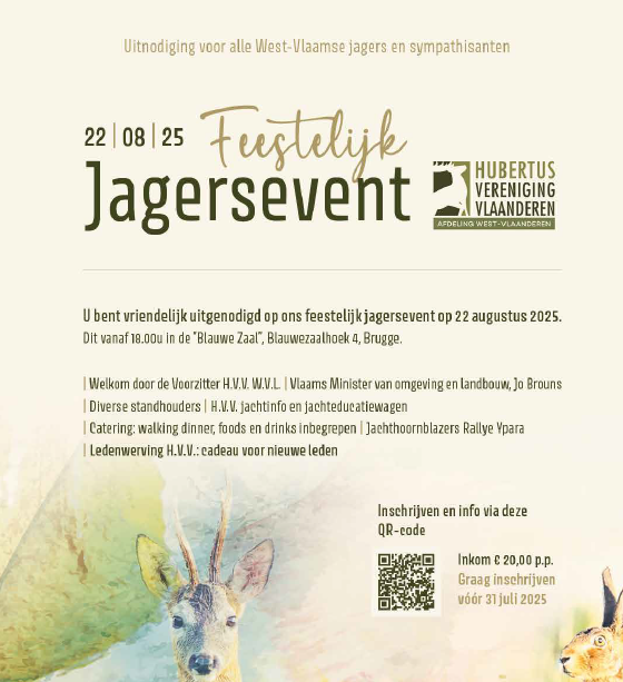 Op 22 augustus is het zover: dan heten wij iedereen welkom in Damme, een ontmoetingsplek voor iedereen met een interesse in de jacht. Hier kunt u genieten van een ontspannen sfeer, een frisse pint en smaakvolle catering, terwijl u gelijkgestemden ontmoet en uw passie voor de jacht deelt. Er is tevens een wervingsactie voor nieuwe leden van Hubertus Vereniging Vlaanderen.